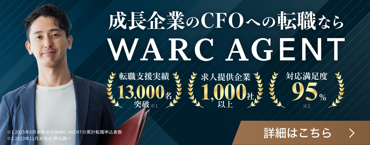 WARC AGENTは管理部門に強い転職エージェントです。CFO転職に詳しいエージェントが丁寧にサポートします。理想のキャリアを実現させたい方はぜひ、WARC AGENTまでお気軽にご相談ください。