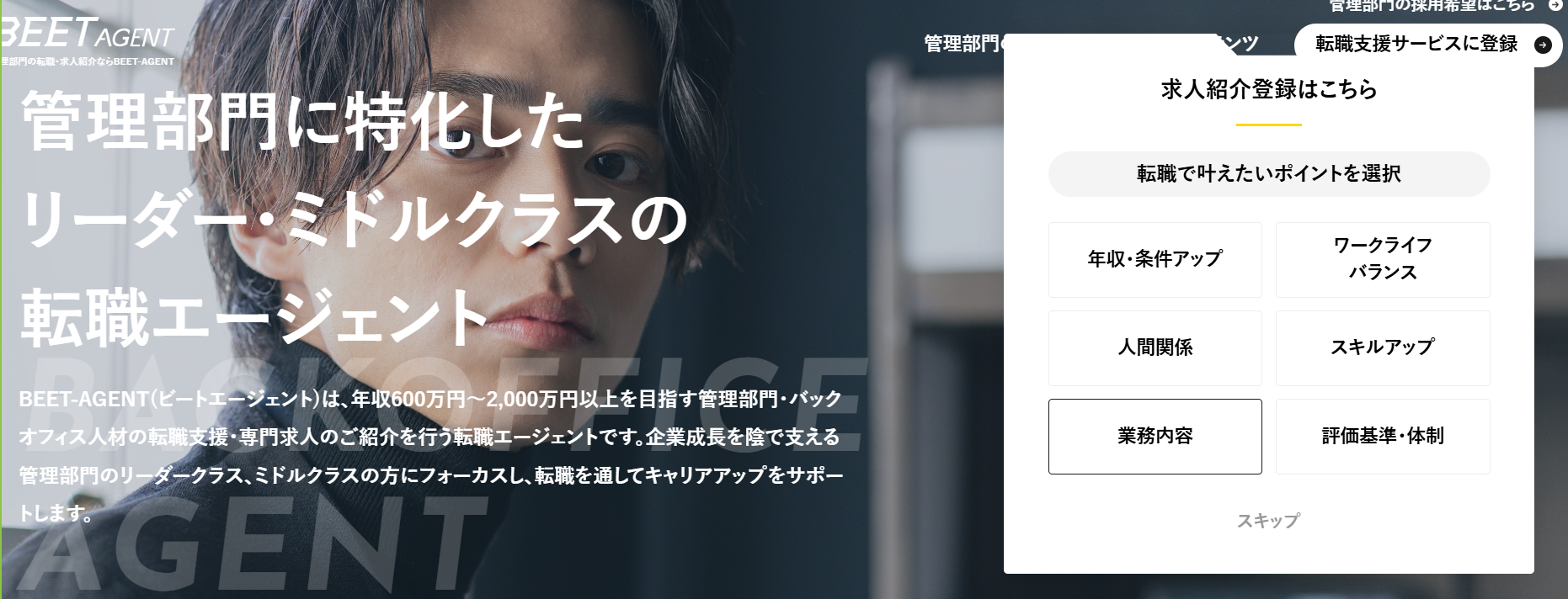 BEET-AGENTは、管理部門のリーダー・マネージャー層に強み。希少な非公開案件や年収1,000万円以上の求人も多数。経理財務・法務・内部監査など専門職コンサルティングへの支援も万全で、手厚い情報提供・条件交渉力が高評価です。