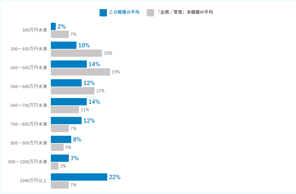 dodaの調査によれば、内部監査の平均年収は746万円で、「企画/管理」系職種の中でも高収入です。年収の分布は以下のとおりです。