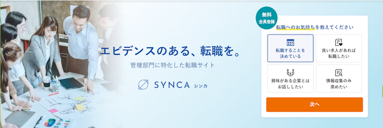 SYNCAは管理部門に特化したスカウト型転職サービスです。経理・財務・経営企画・CFO候補など、経営に近いポジションの求人を中心に扱っています。