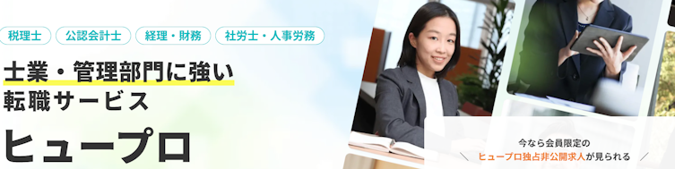 ヒュープロは会計士・税理士・経理など士業・管理部門に特化した転職エージェントです。FAS、監査法人、コンサル、事業会社の経理財務など幅広い求人を扱っています。求人数は10,000件以上と豊富で、未経験からハイクラスまで幅広い層に対応しています。