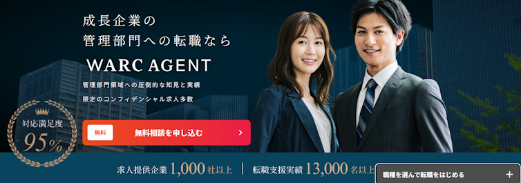 WARC AGENTはハイクラス管理部門の転職支援に特化したエージェントです。IPO準備企業を含む成長企業の求人を多数保有し、管理部門特化の専門性の高い支援が受けられます。