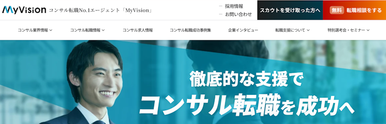 MyVisionはコンサル・FASなどプロフェッショナル職種に特化した転職エージェントです。Big4 FASや戦略コンサルなどへの転職支援実績が豊富で、コンサル業界出身のアドバイザーが在籍している点が強みといえます。